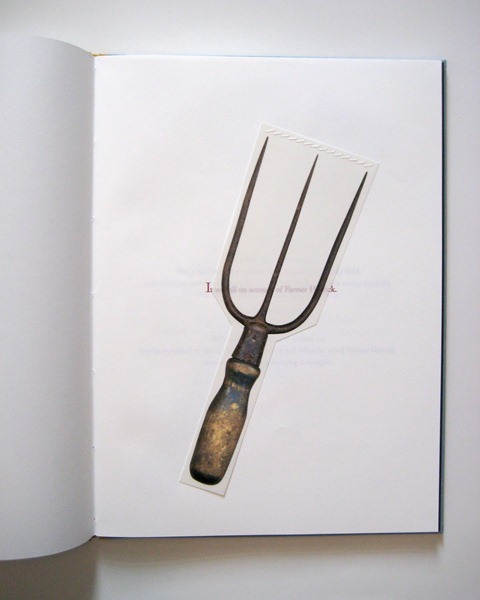 Not unlike Deschamps’s book, Ann Tyler’s Billy Rabbit also revisits historical trauma, but in Tyler’s book, readers become directly implicated in the depicted violence. With the singsong, simplistic narration of a children’s book, Tyler’s tale tells of a rabbit named Billy wrongly suspected of stealing a turnip from Farmer Hayrick’s turnip patch. To proceed with the story, readers must lift sewn-on images of farm tools to reveal the story’s text underneath. As Billy is captured for his assumed “crime,” readers become part of a lynch mob, themselves having to “wield” the very implements used to torture Billy in the hours leading up to his death. Through the interactive structure of the artist’s book, Tyler refuses to let her readers occupy a position of emotional detachment from the history of racial violence in America. In this way, Tyler’s work insists that the traumas of lynching continue to be remembered--and felt--into the future.
