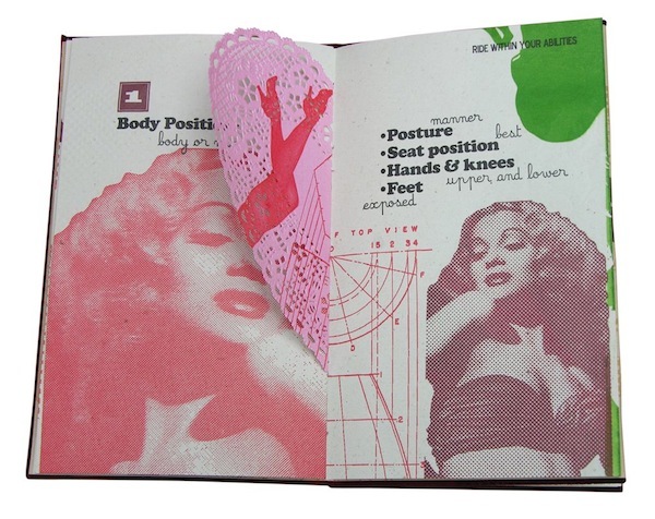 Ellen Knudson’s Wild Girls’ Redux: An Operator’s Manual is based off of an earlier book Knudson printed that included a list of instructions for becoming a "wild girl." Wild Girls’ Redux revisits many of the same themes of the earlier book: women’s self-fashioning, sexism, and female body image. The binding is in the form of an accordion portfolio, with two pamphlets sewn into the binding. These pamphlets contain rather disparate items; pink heart paper doilies, white doily placemats, flocked paper covers, and green office ledger papers are printed over with text from a motorcycle operating manual and photographs of 1950s pinup girls. Feminine doilies are juxtaposed with office ledgers; machinery is juxtaposed with images of the female body. The motorcycle driving and safety instructions are transformed within the context of this book, becoming tongue-in-cheek instructions on how to handle a woman’s body: "Become familiar with the equipment;" "Be resistant to penetration;" "Use caution and squeeze—never grab." Knudson reshapes the significations of the materials in her book in order to discuss gender dynamics and expose sexism.
