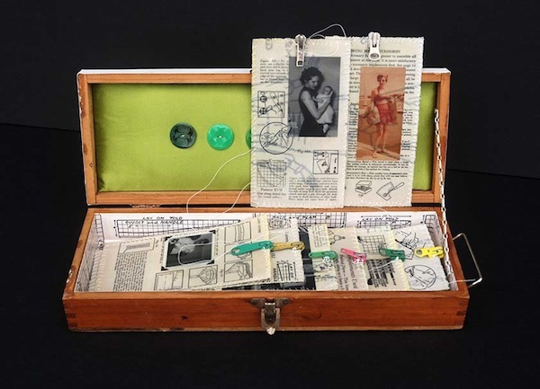 Knudson exposes how the female body is often fragmented into parts for male consumption. Julie Shaw Lutts also comments on this fragmentation in her one-of-a-kind book Alterations and Adjustments. Like Wild Girls Redux, Alterations and Adjustments makes use of schematics, but Lutts incorporates sewing patterns into her work. These patterns, mixed together with vintage photographs, form twenty hand-sewn collage pieces with vintage zipper pulls at the top of each piece. These collage pieces act as the "pages" of the book and are housed inside a vintage wooden box that Lutts has decorated with fabric and buttons. When one turns these collage pages over, one sees that they become pieces of a puzzle called "Pattern for Success." The pieces show the body parts of four female figures. Once the puzzle is put together, arrows point to two of the women to show what "ideal" feminine traits should be a part of this pattern for success: desirability, a husband, responsibility, and so on. Lutts's book reveals how straitjacketed women were in the 1940s and 1950s. What is more, she makes use of sewing in ways that resist the gender normative use of sewing presented in her book. Lutts reinvents this activity, making a domestic activity such as sewing a source of female empowerment.