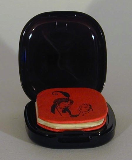At first glance, Cosmeceutical Collection, an artist’s book by Alicia Bailey, may appear to be like any other book with its thick, pink, hard cover binding. However, one may be surprised to find that the book is not full of pages, but rather, it acts as a box that holds three miniature books in the form of makeup: eyeshadow, blush, and a tube of mascara. Upon opening the eyeshadow case, one will find a mirror and three little blue books in the shape of eyeshadow palettes with the words ‘Tossico,” “Spirito,” and “Bella” written separately on each. Moving on to the circular, compact blush case, inside is an accordion-style story book with words on one side of the page and drawings of women’s faces on the other. The top applicator piece of the book is red and displays a drawing of a woman holding a mask. Lastly, the mascara is held in a glass tube with a picture of a woman’s before and after picture using the product surrounding the tube. Pulling the mascara brush out of the tube will unveil a brown scroll containing a story about cosmetics gone wrong.